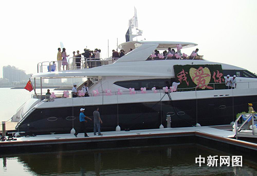 中新網(wǎng)海口3月20日電(付美斌)“從這一刻起,我將始終與你為伴,將我的一生交付與你,共同分享、共同承擔(dān)所有的未來……”3月20日下午3時許,一對“新人”在?跒撑弦凰覂r值6000萬元的公主級豪華游艇上舉行浪漫婚禮。據(jù)悉,這是游艇婚禮首現(xiàn)海南島,該場婚禮花費25999元。
