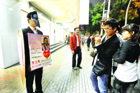 這一次,“阿凡達”出現(xiàn)在福州八一七路南街公交站附近的人行道上,只見他身上掛著一塊牌子,手里還捧著一塊,上面寫著:“哥膝下有黃金”,“哥喊你來福州相親”,“鳳姐明天我要嫁給你”,“一見鐘情”,“求求你,迷戀哥,哥真的不是傳說”……更引人注意的是,他手上捧著的那塊牌子上,還有一張羅玉鳳的照片。