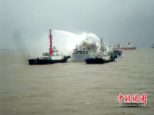 6名消防隊(duì)員探身到艙口,緊扶艙邊一根被灼得滾燙的管道,小心翼翼地下到艙底,水槍一陣狂掃,明火漸漸熄滅。