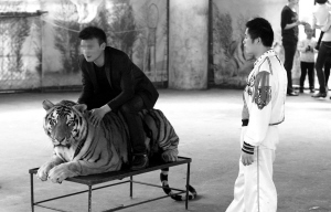 這時(shí),在臺(tái)上站著4名穿著工作服的男性工作人員,其中1人負(fù)責(zé)拍照,其他3人看守老虎,此外還有一名女性工作人員在邊上幫忙吆喝并收取每次30元的合影費(fèi)。