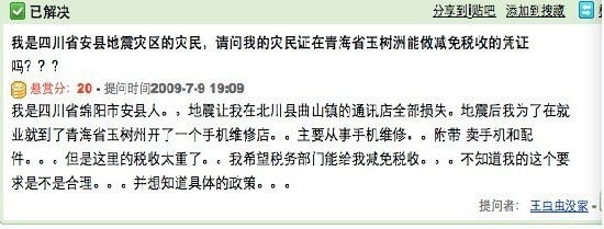 玉樹地震發(fā)生當(dāng)日,一位名叫“王蟲蟲沒家”的網(wǎng)友,因為在去年7月百度知道上發(fā)出的一個帖子被人重新翻起,而成了數(shù)萬網(wǎng)友關(guān)注的焦點。這位網(wǎng)友曾經(jīng)在北川開了一家手機維修店,5.12汶川大地震中北川被震毀,幸存下來的“王蟲蟲”在震后選擇到玉樹州重新創(chuàng)業(yè),并想開一家手機維修店。“王蟲蟲”的這番遭遇,引起了網(wǎng)民的高度關(guān)注,“王蟲蟲”也被網(wǎng)友稱為最悲情的人物。因為“王蟲蟲”最后一次上網(wǎng)登錄的時間已是地震一個月前了,他(她)能否再次躲過這一次天災(zāi),成了眾多網(wǎng)友關(guān)注的焦點。四川在線記者在到達玉樹后不久,想盡辦法找尋這位網(wǎng)友。