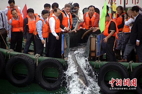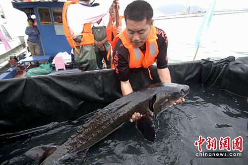 中新社廈門4月22日電 (記者 陳悅)22日下午,廈門在九龍江雞嶼海域放流108尾有“魚類活化石”之稱的中華鱘。其中四只在海洋公園保育基金贊助下,首度配上“衛(wèi)星追蹤信標”,相關(guān)專家表示,這將是中華鱘研究及保育的一大突破,將開展有效保育中華鱘新的一頁。