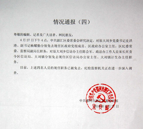 27日,漯河市源匯區(qū)委宣傳部通報說,中共源匯區(qū)委常委會研究決定,對原大劉鄉(xiāng)黨委書記史洪濤、副書記楊耀勤分別免去現(xiàn)任區(qū)政府黨組成員、區(qū)政府辦公室主任,區(qū)紀委常委、監(jiān)察局副局長職務;對原大劉鄉(xiāng)信訪辦主任陳會軍、政法辦工作人員宋長興責令區(qū)信訪局、大劉鎮(zhèn)分別免去現(xiàn)任區(qū)信訪局辦公室主任、大劉鎮(zhèn)計生辦主任職務。目前,上述四名人員的現(xiàn)任職務已被免去。