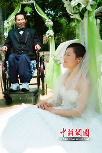 中新網(wǎng)徐州5月7日電 (記者 邵國棟 董敏)拍攝一套婚紗照對結(jié)婚新人是一件再普通不過的事了,但是對于江蘇銅山縣大彭鎮(zhèn)34歲高位截癱的范進(jìn)來說,卻是一件不可能做到的事情。為了幫這對特殊的新人圓夢,徐州市眾多影樓紛紛伸出愛心之手,愿意為他們免費(fèi)拍攝婚紗照。6日下午,在徐州市新新娘婚紗影樓大廳,記者見到了范進(jìn)和他的妻子李美玲。“自從癱瘓后就沒想過結(jié)婚一事,更別說拍婚紗照了!”范進(jìn)這樣對記者說。