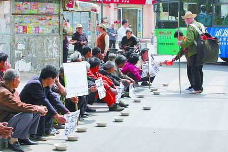 昨日上午,東風路省中醫(yī)院門前,30名農(nóng)民工手持瓷碗,在路邊排成一行乞討,不少市民出于同情,為農(nóng)民工留下一些零錢。