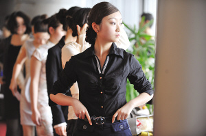 候場區(qū),美女云集的地方,只要一個(gè)轉(zhuǎn)身,你就可以看見近千名佳麗有的在偷偷補(bǔ)妝,有的對著鏡子練習(xí)微笑。在等候面試的美女中,有帶著綠色美瞳的美國加州留學(xué)生,有穿背帶褲剛剛高中畢業(yè)的學(xué)生,還有身著職業(yè)裝想換個(gè)工作的公司白領(lǐng)。“現(xiàn)在工作不好找,所以只要有招聘就來試試咯!边@是記者在現(xiàn)場聽到最多的一句話。