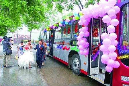 5月16日清晨,一輛被裝扮一新的“公交婚車”從石家莊市駛往井陘。有過往市民在看到這輛引人注目的“婚車”后,忍不住發(fā)出感慨:“這比凱迪拉克當(dāng)婚車還拉風(fēng)啊!倍俗谶@輛公交婚車上的新郎趙欽,則一路幸福地盼望著迎接新娘。據(jù)介紹,此次婚禮的一對新人都是公交司機(jī),以公交車當(dāng)婚車既是因為對公交車有特殊感情,也是希望倡導(dǎo)低碳生活。