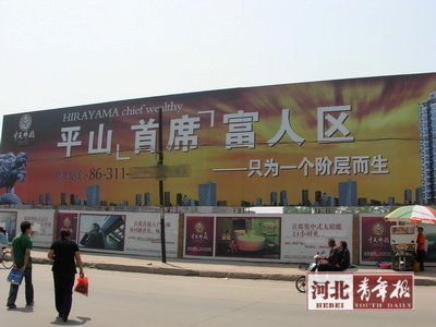 “平山‘首席’富人區(qū)——只為一個階層而生!睆娜ツ觊_始,位于平山縣繁華地段的這則巨幅樓盤廣告就吸引了不少路人的目光,也引來了不少爭議。