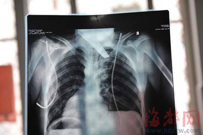 前晚,在第一醫(yī)院急救室,經(jīng)過4個多小時的搶救,醫(yī)生將匕首從小勇身上取出,發(fā)現(xiàn)這把匕首的刀尖扎斷了1厘米。由于小勇肺部被刺中,昨天上午,醫(yī)生再次進行了3個多小時的手術(shù),切除了受傷的部分肺,直到下午,小勇才挺過來!巴α艘灰梗F(xiàn)在總算醒了過來!睏钆恳灰箾]睡,守在手術(shù)室外7個多小時,生怕兒子再醒不過來。不過,由于傷勢嚴(yán)重,小勇目前戴著氧氣呼吸,仍未脫險。
