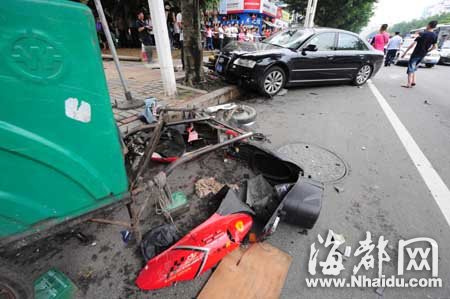 目擊者鄭小姐說,當時她騎著電動車,在豪華轎車后面,與其同向行駛。豪華轎車先刮碰到一名騎自行車的女子,接著,非機動車道上一名騎摩托的男子和一名騎電動車的男子被撞飛,高度超越小車車頂,又重重摔到了人行道上。附近商家則說,豪華車是為躲避騎自行車的女子,打方向盤向右避讓,隨即撞上兩名騎車的男子。“如果沒這棵樹就慘了,可能更多人被撞!备呦壬男≤嚠敃r就停在事發(fā)地附近等朋友。他說,他先是聽到一聲刺耳的剎車聲音,循聲看去,看到兩名騎車男子被撞飛。另有目擊者說,豪華車撞人后繼續(xù)往前沖,撞倒路邊的電話亭,再撞上行道樹后才停下。受傷的三人中,一人昏迷不醒,滿身是血。豪華車司機沒有受傷。