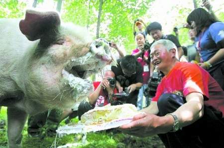 昨日,建川博物館為“豬堅強”辦了新生兩周年慶典!柏i堅強”洗了澡,穿上了新衣服,引來眾多游客圍觀。第一次吃生日蛋糕,“豬堅強”胃口很好,3分鐘就吃完了。