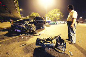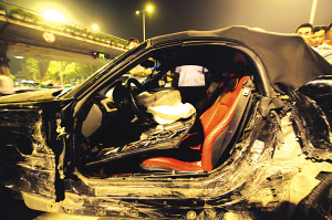 “乖乖,我跟在他后面說他要出事,這車開得像飛一樣,果不其然才一分鐘不到,真的出事了!蹦繐羰忻裢蹰L來先生說,事發(fā)時(shí)這輛寶馬跑車從新街口方向,由東向西沿漢中路如飛一樣開去。由于車速很快,加上深夜寶馬跑車發(fā)出噪音,讓馬路上同方向車輛躲閃不及,其車子后面好像還有一輛超速跑車,王長來先生懷疑兩車在超速飆車!笆袇^(qū)內(nèi)貼地飛行能不出事嗎?”王長來說,他跟到漢中門長途汽車站門口,寶馬Z4敞篷跑車速度快得讓他吃驚,突然在漢中門高架下,這輛寶馬車與一輛本田商務(wù)車相撞,商務(wù)車左側(cè)車頭被撞得粉碎,寶馬車則丟失了自己的左側(cè)車門,騰空在原地打了一個(gè)180度轉(zhuǎn),原本車頭向西被撞擊后,車頭一下子朝東了。