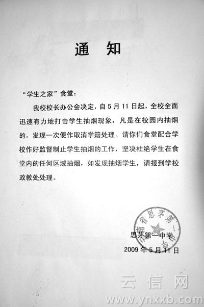 2010年6月1日,普洱市思茅區(qū)教育局向區(qū)屬23所校園發(fā)出《思茅區(qū)教育局關(guān)于在校園內(nèi)公共場所禁煙的通知》(以下簡稱《通知》)!斑@是云南省第一家自發(fā)進行控?zé)煿ぷ鞯慕逃龁挝!痹颇鲜〗】到逃責(zé)熮k公室主任趙白帆說。