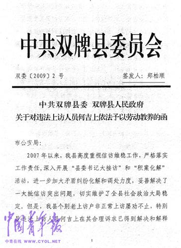 33歲的何守業(yè)至今不敢回家。其父何吉上因舉報(bào)村支書侵占退耕還林款未見“效果”,多次上告,被認(rèn)定“沖擊國家機(jī)關(guān)”。在檢察機(jī)關(guān)認(rèn)定其不構(gòu)成犯罪之后,湖南省永州市雙牌縣委書記鄭柏順簽發(fā)“勞教”文件。2009年8月,永州市“勞教委”決定對何吉上勞動(dòng)教養(yǎng)一年。
