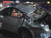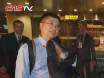【解說】12日18時(shí),趙本山乘坐專機(jī)飛抵寧波櫟社國際機(jī)場。5分鐘后,頭戴白色球帽,身穿黃黑相間T恤,一身休閑打扮的趙本山在工作人員和隨從的簇?fù)硐聫馁F賓樓走出,步向停靠在門口的專車。紅光滿面的趙本山看起來氣色和心情都不錯(cuò),全程面帶微笑,還多次向記者招手示意。