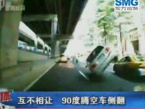 實(shí)拍:兩車互不相讓 90度騰空車側(cè)翻