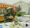 【解說】在觀眾的熱情邀請下,曹師傅又表演了一個他的拿手絕技,在氣球上切肉絲。氣球下面放著三根鋼針,肉放在氣球的上面,用刀切成粗細(xì)均勻的肉絲而氣球卻沒有破。讓市民真正感受到了大師的風(fēng)采。