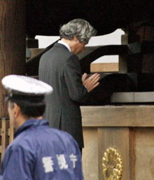 | 10月17日,日相小泉無視亞洲各國的強(qiáng)烈反對(duì)再次參拜供奉有二戰(zhàn)日本甲級(jí)戰(zhàn)犯的靖國神社。對(duì)此,中國外交部發(fā)表聲明,嚴(yán)厲譴責(zé)小泉“拜鬼”。中國駐日本大使王毅也在東京緊急約見日本外相町村信孝,向日方提出強(qiáng)烈抗議。 |