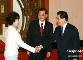 2005年4月29日,胡錦濤與連戰(zhàn)在北京舉行會談,共同發(fā)布兩岸和平發(fā)展共同愿景。 ·促進(jìn)盡速恢復(fù)談判,共謀兩岸人民福祉 ·促進(jìn)終止敵對狀態(tài),達(dá)成和平協(xié)議 ·促進(jìn)兩岸經(jīng)濟全面交流,建立合作機制 ·促進(jìn)協(xié)商臺民眾關(guān)心的參與國際活動問題 ·建立黨對黨定期溝通平臺 |