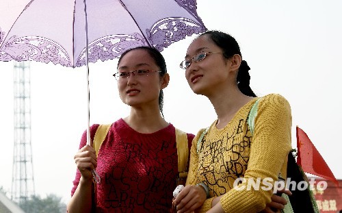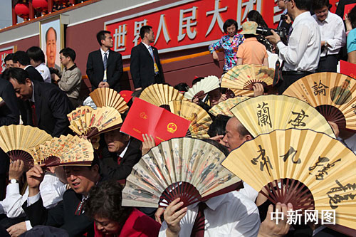 圖:天安門朗日當(dāng)頭照 觀禮臺嘉賓忙遮陽