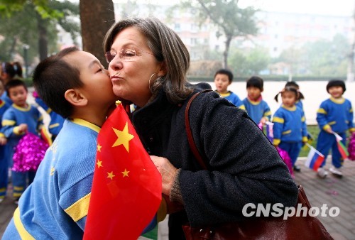 圖:各國(guó)空軍代表團(tuán)隨行夫人參觀藍(lán)天幼兒園