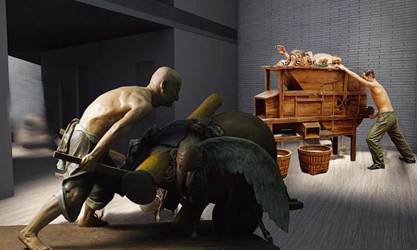 1964至1965年,四川省美術(shù)工作者在劉文彩收租院原址上創(chuàng)作并展出了大型泥塑《收租院》。這臺(tái)泥塑,藝術(shù)而生動(dòng)地再現(xiàn)了舊中國(guó)以劉文彩為代表的地主階級(jí)對(duì)廣大農(nóng)民進(jìn)行經(jīng)濟(jì)剝削和政治壓迫的真實(shí)情景。大型泥塑《收租院》由六組114個(gè)真人大小的泥像組成,依次表現(xiàn)了交租、驗(yàn)租、過(guò)斗、算帳、逼租、反抗的情景。泥塑的人物形象生動(dòng),人物的性格、情感刻劃得十分深刻。114尊人像,個(gè)個(gè)栩栩如生,人物面貌、體態(tài)無(wú)一雷同。