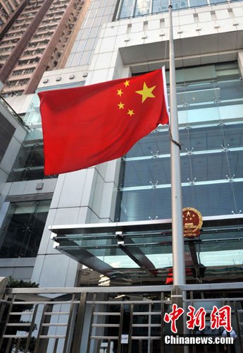 中央駐港機(jī)構(gòu)國旗降半旗哀悼遇難香港同胞