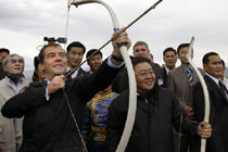 圖:梅德韋杰夫蒙古草原彎弓射箭試身手
