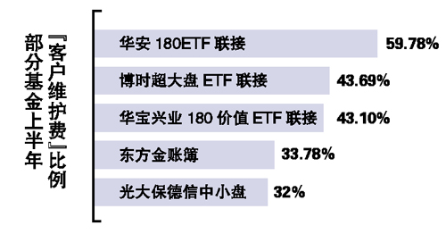 具體來看,18家已公布半年報(bào)的基金管理公司,上半年平均向渠道支出了13.76%的管理費(fèi)用于“客戶維護(hù)”。其中,支出“客戶維護(hù)費(fèi)”占其管理費(fèi)收入最高的三家公司,分別為長(zhǎng)信基金、東方基金、光大保德信基金,三家公司各自支出了自身管理費(fèi)的23.61%、22.25%、20.98%用于“客戶維護(hù)”。而從單個(gè)基金出發(fā),這個(gè)數(shù)據(jù)則更為驚人。整體來說,業(yè)內(nèi)最高三至五成的費(fèi)用支出比例仍然讓人咋舌。