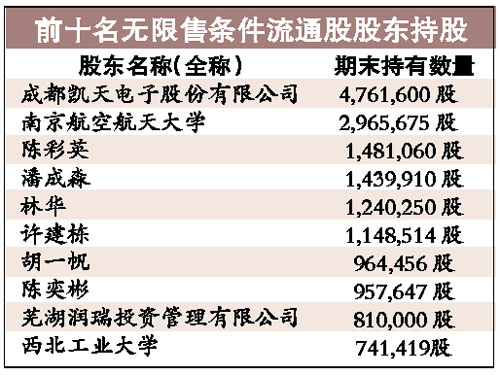 而從三季報看出,在成飛集成大漲的同時,不少投資者斥巨資進入。在十大股東中,除了成都凱天電子、南京航空航天大學(xué),以及西北工業(yè)大學(xué)外,新進入了7大股東,累計增持的804.2萬股,其中陳彩英、潘成淼、林華等5人為自然人持股,蕪湖潤瑞投資也以81萬股,成為第九大股東。沈文軍、張雪娟等已經(jīng)被踢出前十大流通股東。有市場分析師認(rèn)為,無論這5位自然人是什么來頭,都不愧為今年的最牛散戶。(張忠安)