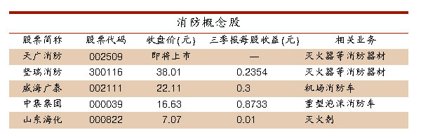 某不愿具名的私募人士向 《每日經(jīng)濟(jì)新聞》記者介紹,目前A股市場包括即將上市的天廣消防(002509)在內(nèi),涉及到消防器材及其相關(guān)領(lǐng)域的上市公司共有5家。其中,9月份剛登陸創(chuàng)業(yè)板的堅(jiān)瑞消防(300116,收盤價(jià)38.01元)和即將登陸深圳中小板的天廣消防均為一線消防設(shè)備生產(chǎn)制造商;威海廣泰(002111,收盤價(jià)22.11元)等公司為輔助設(shè)備生產(chǎn)制造商。