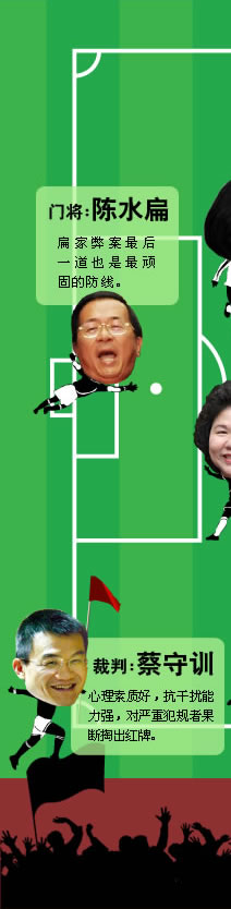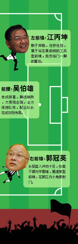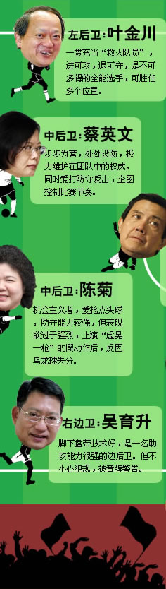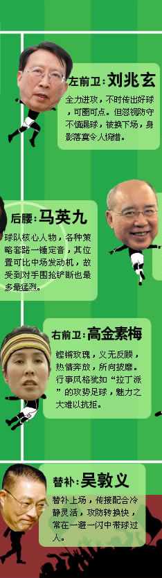 2009年大幕即將落下,臺灣政壇照舊精彩紛呈,多路人馬粉墨登場。在這個情節(jié)跌宕起伏、堪比“足球甲級聯(lián)賽”的舞臺上,眾“球員”充分展示出個人技術(shù)和力量。中新網(wǎng)特別從各支“參賽隊伍”中精挑細(xì)選,組成“本年度全明星陣容”,藉此梳理臺灣政壇發(fā)生的那些人和事,以饗諸位“球迷”。