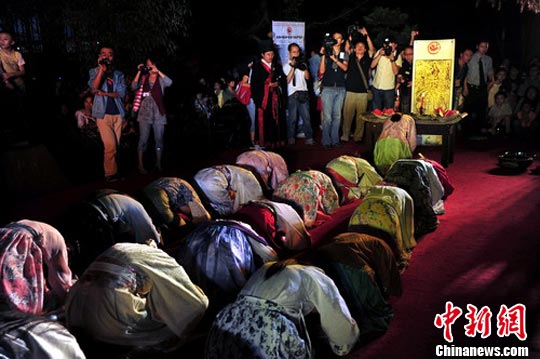 中秋之夜,大雅堂前,多名身著唐裝的美女,“經(jīng)坐”(即雅坐)于席上,行祭拜禮,主祭者“三上香”后,念誦祭月祝文。拜月禮成后,祭拜人員和全體觀眾分食月餅、供果等祭品,宴飲賞月!捌吩率骋再p花,飛羽觴而醉月。”