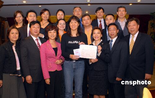 著名中國女排運動員,現(xiàn)任美國女排主教練郎平,十月二十日將赴新澤西州參加美國奧委會的一個頒獎活動,十月十九日郎平取道紐約,受到此間北京鄉(xiāng)親和僑界的熱烈歡迎。紐約州眾議員楊愛倫(前右三)向郎平(前左四)頒發(fā)感謝狀,表彰她為中美兩國女排作出的貢獻,并向郎平贈送了她選區(qū)(發(fā)拉盛)的“護照”。前左三為紐約北京同鄉(xiāng)會會長侯建利。中新社發(fā) 龔文謨 攝