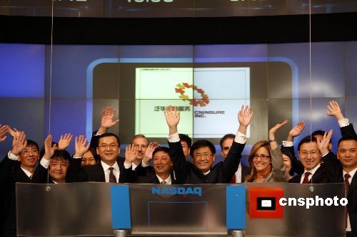 中國(guó)大陸首只保險(xiǎn)中介股--泛華保險(xiǎn)集團(tuán)三十一日在美國(guó)納斯達(dá)克證券交易所成功上市。該公司恰好是在納斯達(dá)克上市的第五十家中國(guó)公司,也是今年在美國(guó)上市的所有中國(guó)公司當(dāng)中上市當(dāng)天表現(xiàn)最好的公司之一。圖為公司董事長(zhǎng)胡義南在納斯達(dá)克出席開(kāi)市敲鐘儀式。中新社發(fā) 李靜 攝