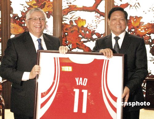 正在紐約出席聯(lián)合國大會的中共中央政治局委員、北京市委書記、北京奧組委主席劉淇,十一月一日會見美國職業(yè)籃球協(xié)會(NBA)總裁大衛(wèi)·斯特恩,斯特恩向劉淇贈送了姚明在NBA火箭隊的十一號球衣。中新社發(fā) 李靜 攝