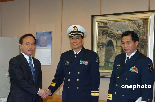 11月29日上午,正在日本進行正式友好訪問的中國海軍軍艦訪日團指揮員肖新年少將一行來到日本防務(wù)省,與日本軍界進行交流活動。圖為肖新年少將(中)與日本防務(wù)省遷優(yōu)參事官(左)握手,訪日中國海軍導(dǎo)彈驅(qū)逐艦“深圳號”艦長朱建達上校(右)陪同會見。中新社發(fā) 滕劍峰 攝
