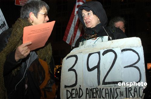 圖為祖母反戰(zhàn)團(tuán)的創(chuàng)始人七十六歲的瓊維莉(右)胸前掛著截至當(dāng)日在伊戰(zhàn)陣亡的美軍士兵總?cè)藬?shù)的牌子。