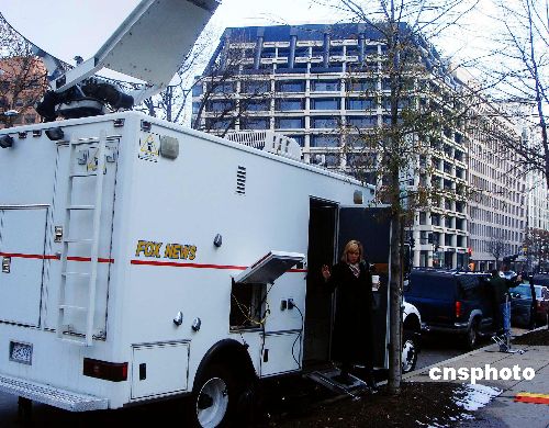 聞風(fēng)而至的美國各主流媒體將轉(zhuǎn)播車直接開到大樓附近街區(qū),時(shí)刻準(zhǔn)備直播和報(bào)道這一突發(fā)事件,圖為Foxnews新聞停在世行總部大樓的直播車。
