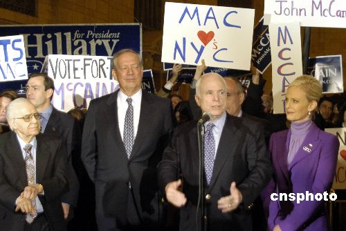 美國(guó)共和黨總統(tǒng)參選人、亞利桑那州的聯(lián)邦參議員麥凱恩(右三)四日在紐約中央火車站與支持者和記者見(jiàn)面,為五日美國(guó)二十余州進(jìn)行的二00八年大選初選作最后沖刺。希拉里的支持者也來(lái)到現(xiàn)場(chǎng),進(jìn)行“選前對(duì)抗”。中新社發(fā) 李靜 攝