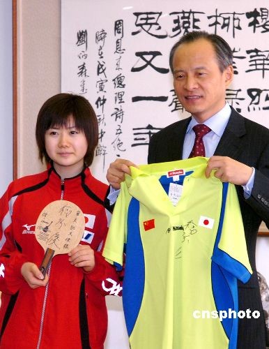 圖:日本乒乓球運動員福原愛向崔天凱大使贈送球衣