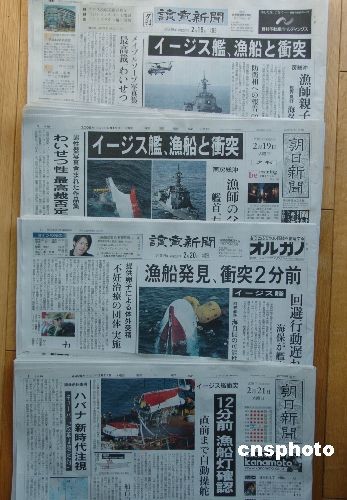 針對2月19日發(fā)生的日本宙斯盾軍艦撞沉漁船的事故,日本各大媒體連日來均在頭版頭條位置或者新聞節(jié)目的頭條時(shí)間突出報(bào)道,圖為19日至21日的合計(jì)發(fā)行量近2000萬份的《讀賣新聞》和《朝日新聞》的頭版頭條報(bào)道。據(jù)報(bào)道,撞擊事件在日本政界引發(fā)了軒然大波,在野黨紛紛質(zhì)疑擁有“世界上最先進(jìn)的雷達(dá)系統(tǒng)”的軍艦為何突然不靈了,而首相福田則可能因此再次遭受新的打擊。中新社發(fā) 段躍中 攝