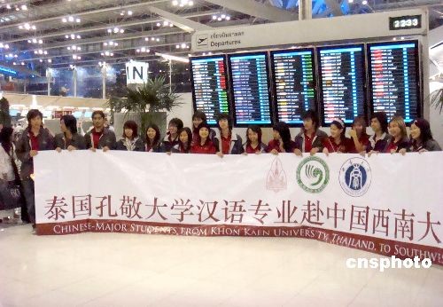 來(lái)自泰國(guó)孔敬大學(xué)孔子學(xué)院的五十七名泰籍本科生帶著家長(zhǎng)與老師的諄諄教誨五日飛往重慶中國(guó)西南大學(xué),開(kāi)始他們?cè)谥袊?guó)為期兩年的學(xué)習(xí)生活,這標(biāo)志著泰國(guó)孔敬大學(xué)孔子學(xué)院與中國(guó)西南大學(xué)的“一加二加一漢語(yǔ)本科”合作項(xiàng)目正式啟動(dòng)。孔敬大學(xué)孔子學(xué)院院長(zhǎng)黃小明說(shuō),今天飛抵重慶的學(xué)生是兩校合作項(xiàng)目“一加二加一漢語(yǔ)本科”招收的第一批學(xué)生,本意是第一、第四年在泰國(guó),第二、第三年在中國(guó)學(xué)習(xí),畢業(yè)時(shí)學(xué)生們將得到中泰兩校頒發(fā)的畢業(yè)證書(shū)。中新社發(fā) 顧時(shí)宏 攝