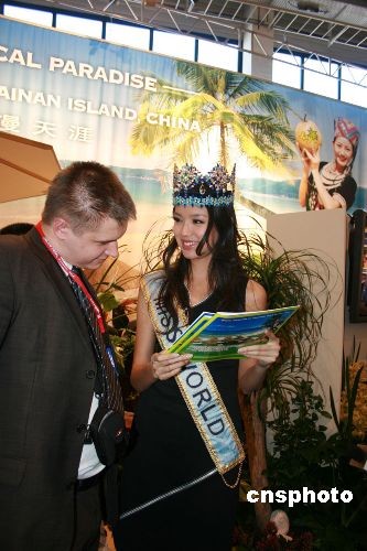 3月5日,2008柏林國(guó)際旅游展(ITB BERLIN)開幕,展覽為期5天將持續(xù)到9日。圖為第57屆世界小姐張梓琳作為“三亞形象大使”出現(xiàn)在展館。中新社發(fā) 關(guān)向東 攝