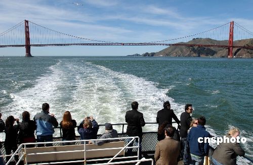 3月初的美國(guó)舊金山陽(yáng)光明媚,大批游客乘坐旅游船觀賞金門(mén)大橋的雄姿。首批中國(guó)赴美旅游團(tuán)有望在今年夏天成行,中國(guó)內(nèi)地旅游社已著手設(shè)計(jì)赴美旅游線路,其中擁有廣泛知名度的舊金山金門(mén)大橋?qū)⒊蔀楸剡x景點(diǎn)。中新社發(fā) 張煒 攝