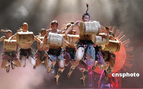 3月14日晚,在中國(guó)引起巨大轟動(dòng)的大型原生態(tài)歌舞集《云南映象》在日本的時(shí)尚策源地澀谷的文化村舞臺(tái)上演,其藝術(shù)總監(jiān)楊麗萍隨之成為媒體追逐的焦點(diǎn)。圖為《云南映象》的第一幕《太陽(yáng)》演出中的場(chǎng)景。中新社發(fā) 朱沿華 攝