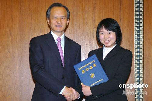 4月13日,中國駐日使館舉行“2007年度國家優(yōu)秀自費留學(xué)生獎學(xué)金頒獎儀式”,34名學(xué)子喜獲此項殊榮。根據(jù)統(tǒng)計,截止于2007年5月1日,目前中國在日各類留學(xué)人員總數(shù)近十萬人,其中90%以上是自費留學(xué)生。圖為中國駐日大使崔天凱向獲獎學(xué)生頒發(fā)獲獎證書。中新社發(fā) 朱沿華 攝