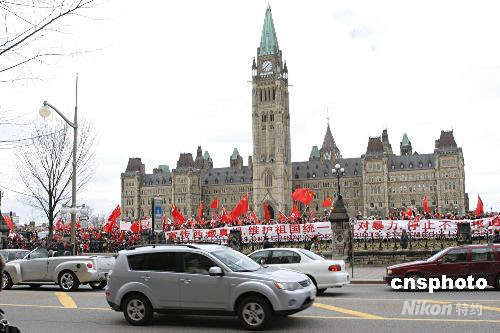 當(dāng)?shù)貢r(shí)間4月13日下午,近萬名來自加拿大各地的華人聚集在首都渥太華國(guó)會(huì)山廣場(chǎng),舉行“宣傳西藏真相,維護(hù)祖國(guó)統(tǒng)一”大型集會(huì)活動(dòng)。集會(huì)全程充滿“和平、友愛”的熱烈氣氛,組織者宣讀了中英文集會(huì)聲明和致加拿大總理哈珀公開信,表達(dá)海外華人“支持一個(gè)中國(guó)、支持北京奧運(yùn)會(huì),反對(duì)暴力”的心愿。中新社發(fā) 捷克佳 攝