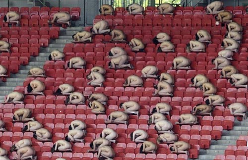 5月11日,在奧地利維也納恩斯特-哈佩爾體育場(chǎng),1800多名奧地利裸體志愿者為美國(guó)攝影師斯賓塞-圖尼克(著名裸體攝影師)擺造型。圖尼克準(zhǔn)備在一座體育場(chǎng)內(nèi)集合2008名裸體志愿者進(jìn)行拍照,為即將開幕的08年足球歐錦賽添彩。