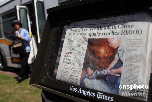 當(dāng)?shù)貢r(shí)間五月十三日,美國洛杉磯地區(qū)的主流媒體和主要中文媒體均在頭版頭條和內(nèi)頁突出報(bào)道四川汶川大地震。圖為當(dāng)天出版的美國主流媒體《洛杉磯時(shí)報(bào)》在頭版突出報(bào)道汶川大地震。中新社發(fā) 張煒 攝
